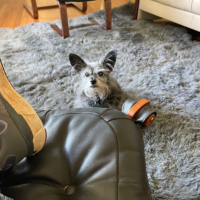 On October 22 (Wednesday), Bruce and I were sitting in the living room reading. Nox slept beside me on the sheepskin rug. She woke up and came over to me.