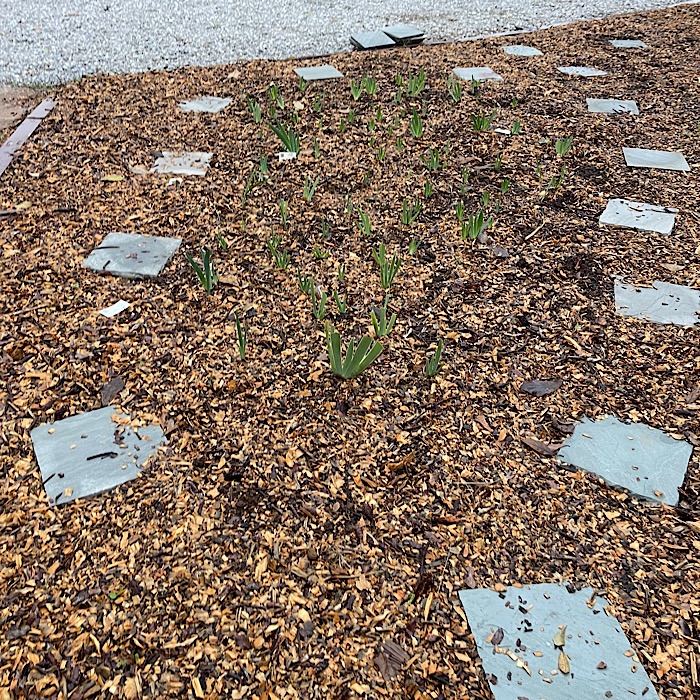 Once the stepping stones were in place, I planted the bulbs and peony.