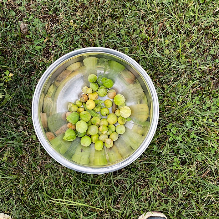 After Bruce headed out, I did some gardening. I harvested the okra, cherry tmatoes, and tomatillos.