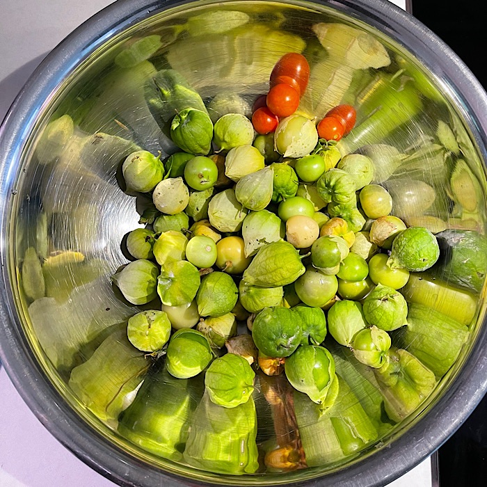 I roasted the tomatillos, peppers from the garden, cloves of garlic, and sliced onion. Once everything was roasted, I started a pot of green chili on the stovetop. While the chili simmered, I went out and harvested a sinkfull of basil.