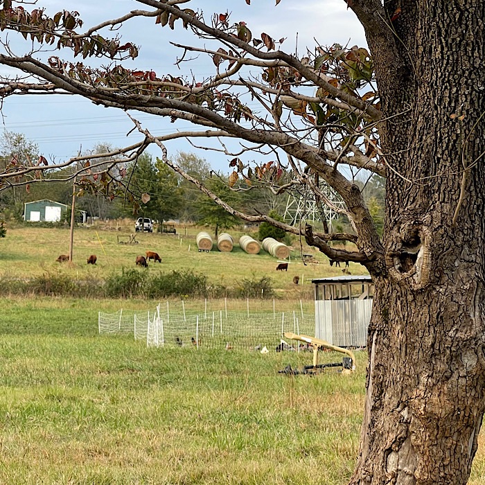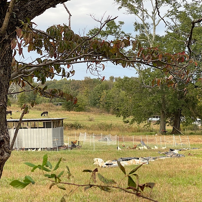 Our neighbor to the north, moved his chicken tractor closer to our property. Nox likes being picked up so she can “see” the chickens.