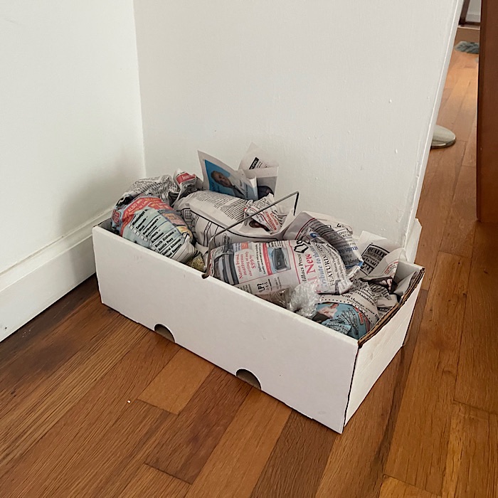 From the shed, I brought in the rest of the sweet potatoes. I wrapped more of the sweet potatoes in paper.