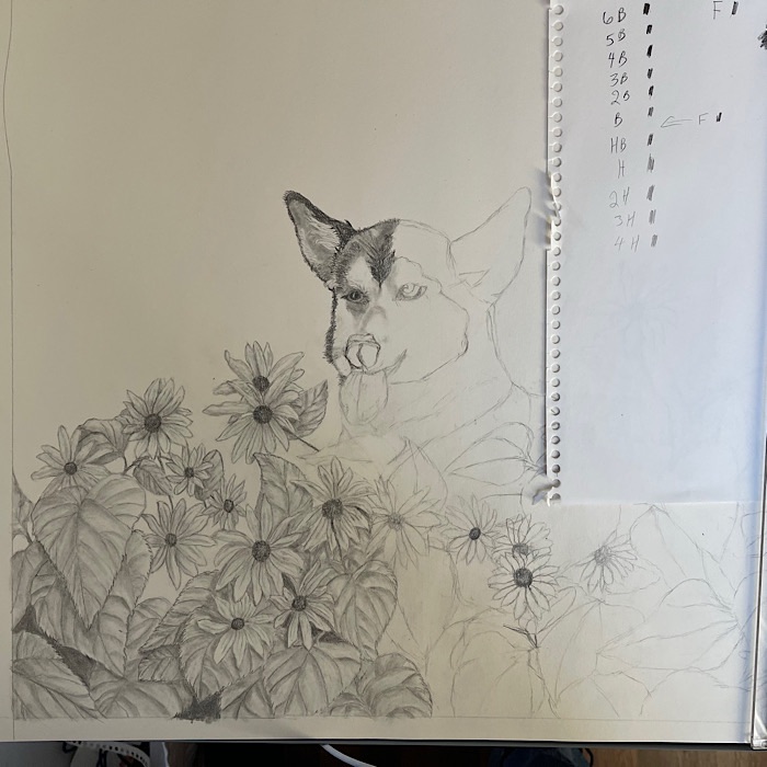 On the right side of the picture is a piece of paper. I use the paper to tell what the hardness of my pencils look like and to help keep my arm from smudging the picture.