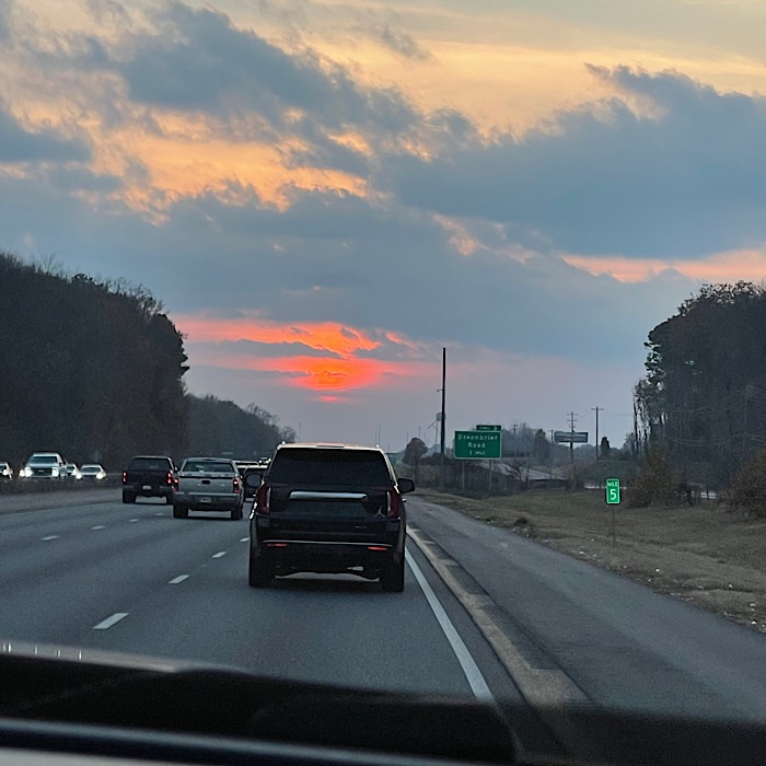 On the way home, the sunset was so beautiful. The sun was a big ball of color sinking behind the grey clouds with streaks of red-orange.