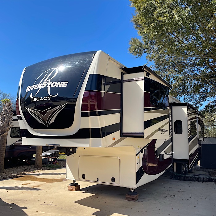 Bruce screwed in some replacement screws. We had missed two screws falling out by the back wheel on the bottom of the RV. With all the shaking in moving, the screws can work loose. We would walk around the RV after arriving at a campsite to check the screws. In this case, we didn’t catch it in time to tighten the screws. We just didn’t know to check there.