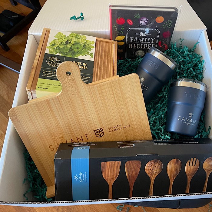 There was a large box sitting on our porch. We didn’t know what it could be. It was a welcome present from our financial services firm. I listed out my hobbies and Bruce didn’t. Can you guess who most of the presents were for?