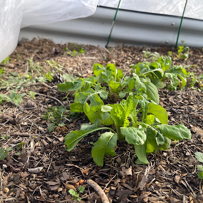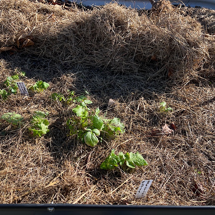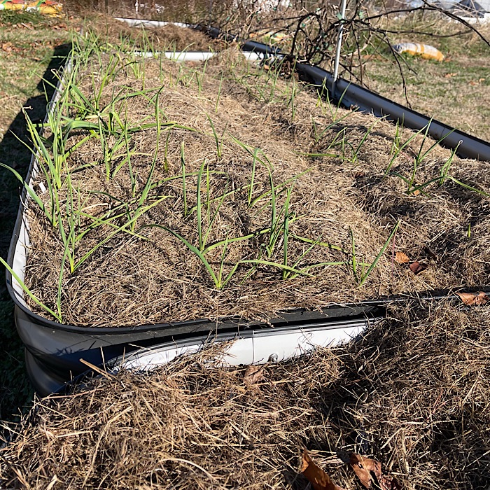 On December 31, 2025, the temperature was up to the low 50s F. We uncovered the plants. I took a picture of the garlic growing through the mulch.