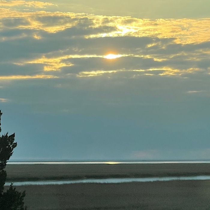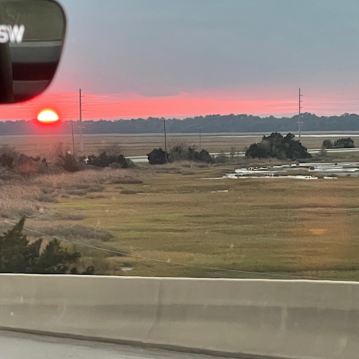 On the way back to Jekyll Island, the setting sun was a ball of red. The sun reflected on the water as we crossed over the Sidney Lainer Bridge. While I wasn’t able to get a picture of the sun’s reflection turning the rive water red, I did snap this picture. Here the sun is sinking over the salt marsh.