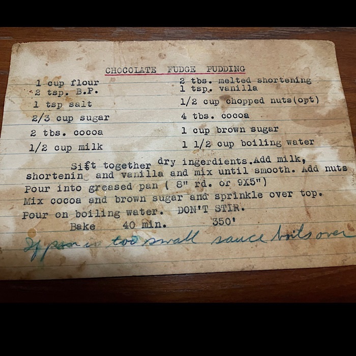 The Chocolate Fudge Pudding Cake recipe is a classic from my childhood. I still make it, although it’s too sweet for my adult taste, and I cut back on the sugar. With ice cream, warm from the oven? Yum! Or whipped cream.