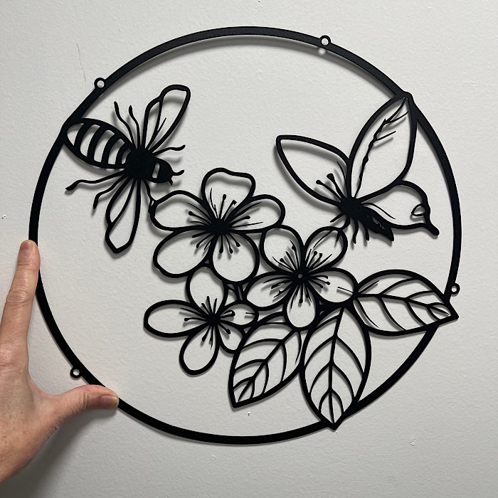 I like how the blackberry leaves and the butterfly wing extend from the circle.
