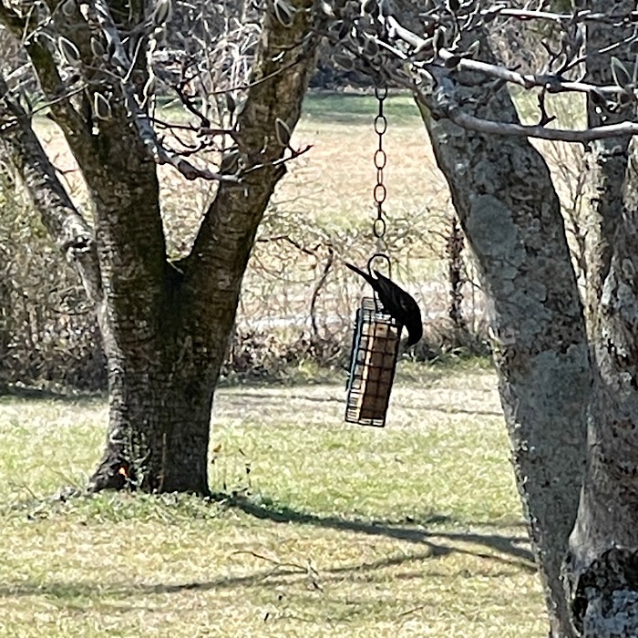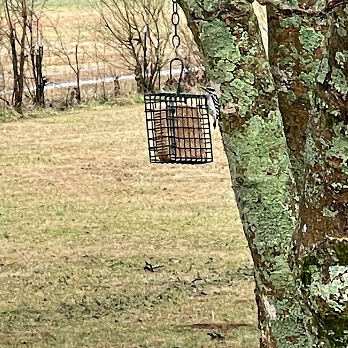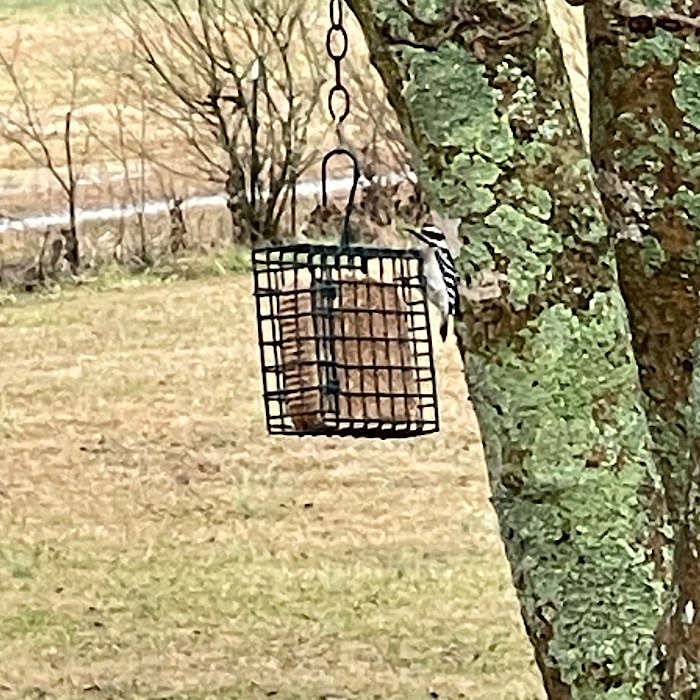 We put out a couple of suet bird feeder this winter. We had a downy woodpecker visit a few times, along with redwing blackbirds. The woodpecker is hard to see on the side of the feeder next to the tree.
