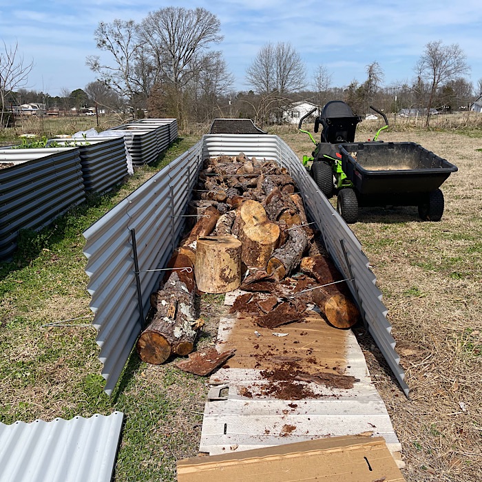 We’ve been using Hügelkultur in all our tall beds. Before, we only used stumps at the ends of the beds and filled the rest with large and small branches. We are hoping the tree logs will make filling the beds easier and the dirt won’t sink as much since it won’t fall through the holes left in the branch piles.