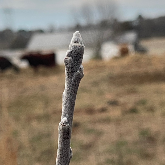 After putting the food away, we went for a walk around Blackberry Homestead. We were looking at things and discussing what we want to do. We noticed the apple trees budding out. Leaves had sprouted on one of the peach trees. The blueberries flower buds are visible.