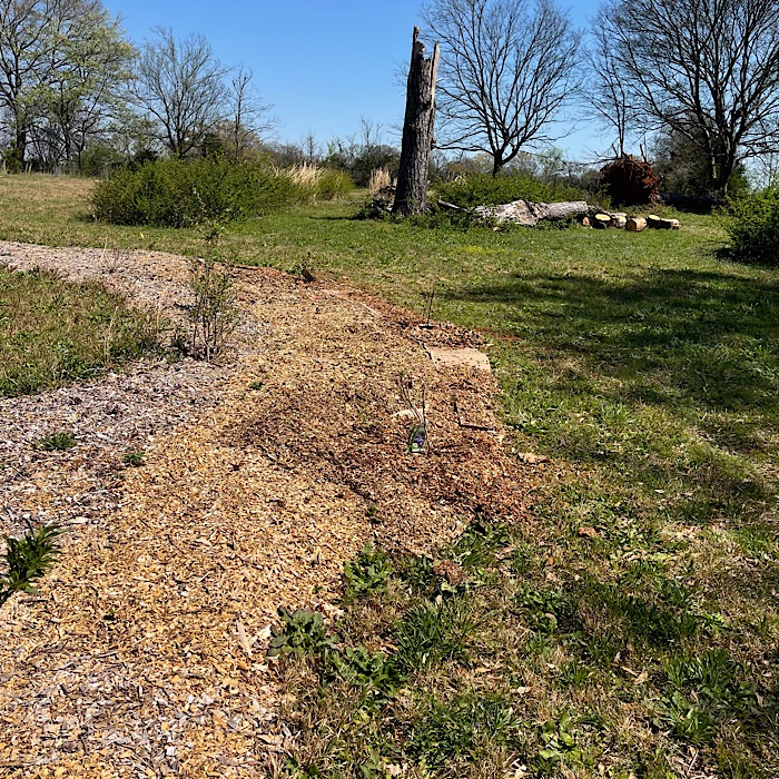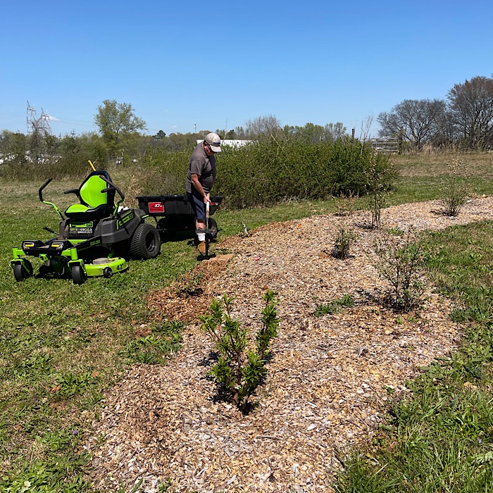 Sunday (March 22), we mulched the blueberries. I cut the cardboard, while Bruce shoveled pine chips into the cart. The timing worked out. I had finished getting the cardboard down on one side, when Bruce rolled up with a load of chips. He shoveled the chips over the cardboard. The same worked on the other side of the ring.