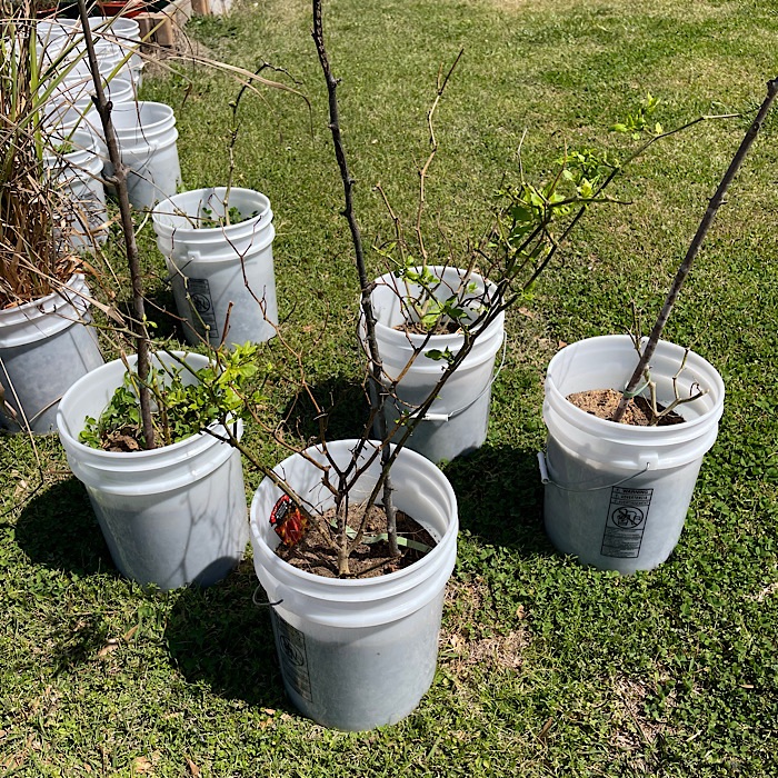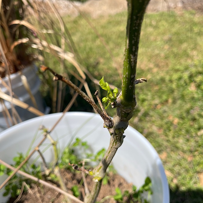 I want to show you something cool, well, cool to me. Last year, I grew peppers in 5-gallon buckets. When the weather prediction was freezing, we moved the peppers into the garage. We left the peppers in the garage for the winter. When the weather warmed up, we took the buckets outside. Several of the peppers were clearly dead. A few had green stems. I watered the ones with green stems. I have been rewarded by the pepper plants leafing out.