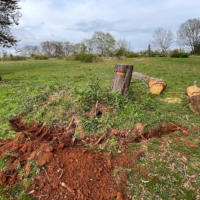 I also noticed Pine Tree 1ās stump. Since I had a shovel with me, I decided to dig around the stump. Bruce had started digging a shallow trench about two feet long and the width of the shovel.