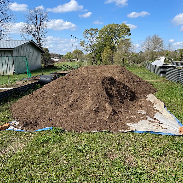 On March 31 (Tuesday), I made a dent in the Bama Pro Mix dirt pile by shoveling it into two raised garden beds. I shoveled dirt into one of the short beds first and into one of the tall beds.