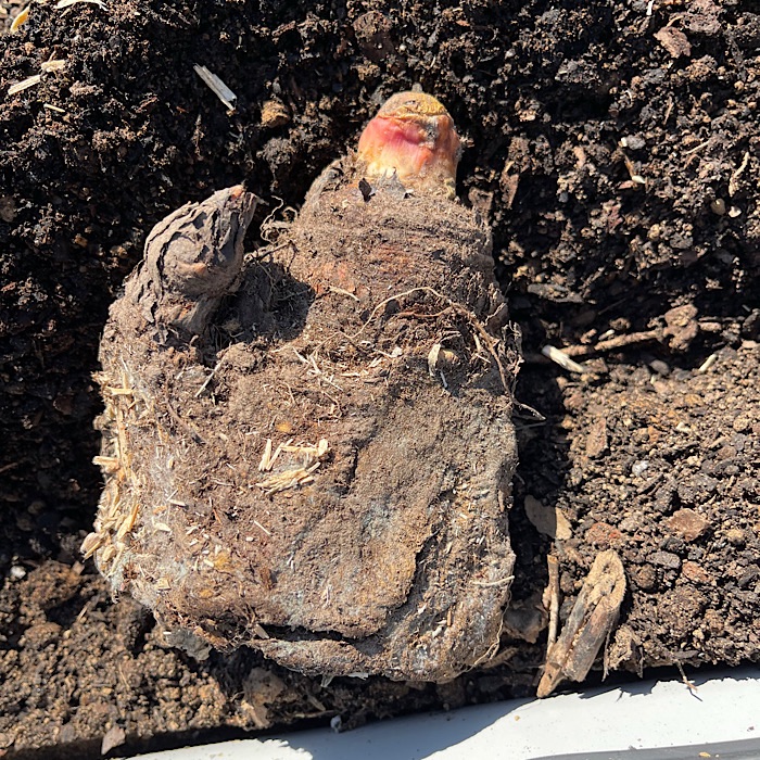 On April 20 (Monday), I planted the two rhubarb crowns that I bought. I was rather disappointed with their appearance. They looked like they had mold on them. I planted them anyway in hopes of the crowns growing.